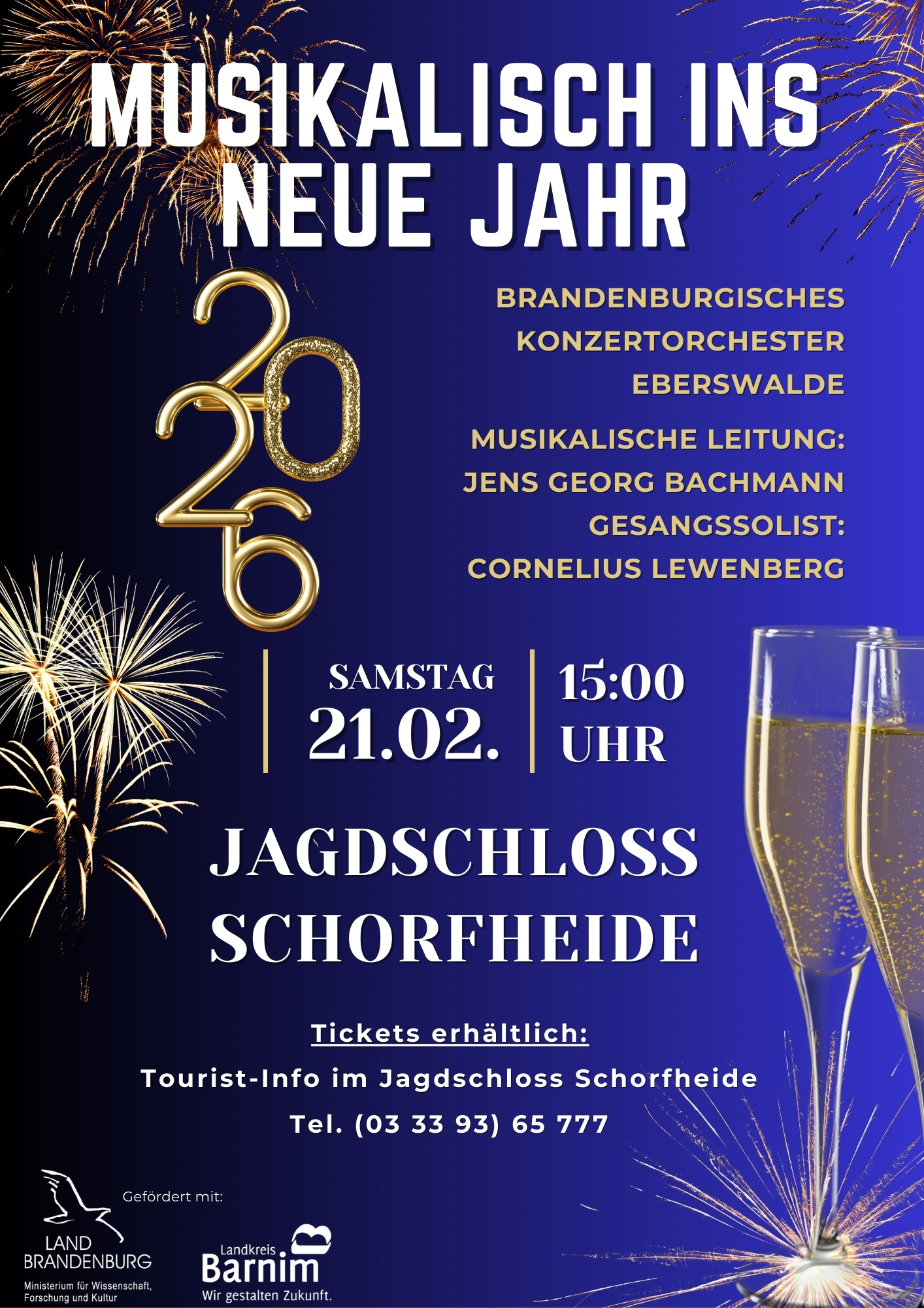 „Prosit 2026!“ – Das Brandenburgische Konzertorchester Eberswalde unter der Leitung seines neuen Dirigenten Jens Georg Bachmann bietet Ihnen mit „Musikalisch ins neue Jahr“ am 21. Februar um 15:00 Uhr einen musikalisch unterhaltsamen und beschwingten Jahresanfang im Jagdschloss Schorfheide!
